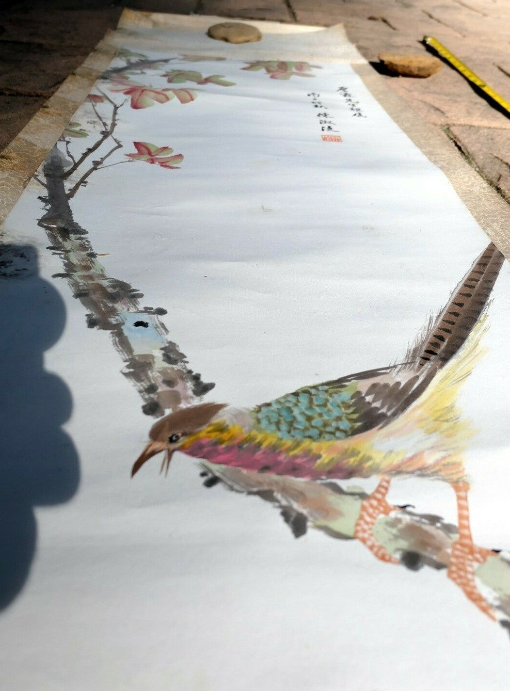 Vintage Chinese Painting Scroll Pheasant Bird Flowers Tree Branch Antique